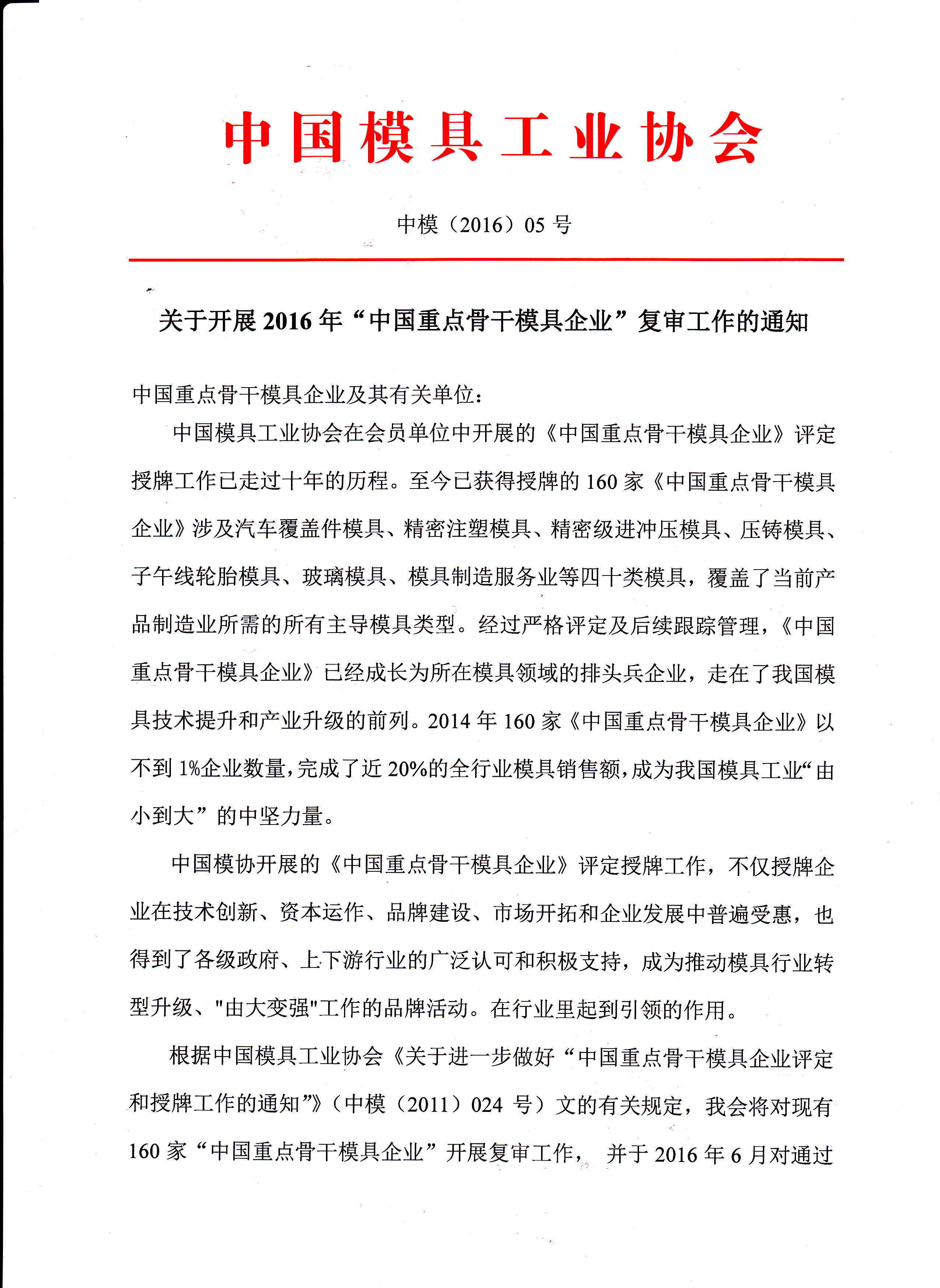 關(guān)于開展2016年“中國重點骨干模具企業(yè)”復(fù)審工作的通知