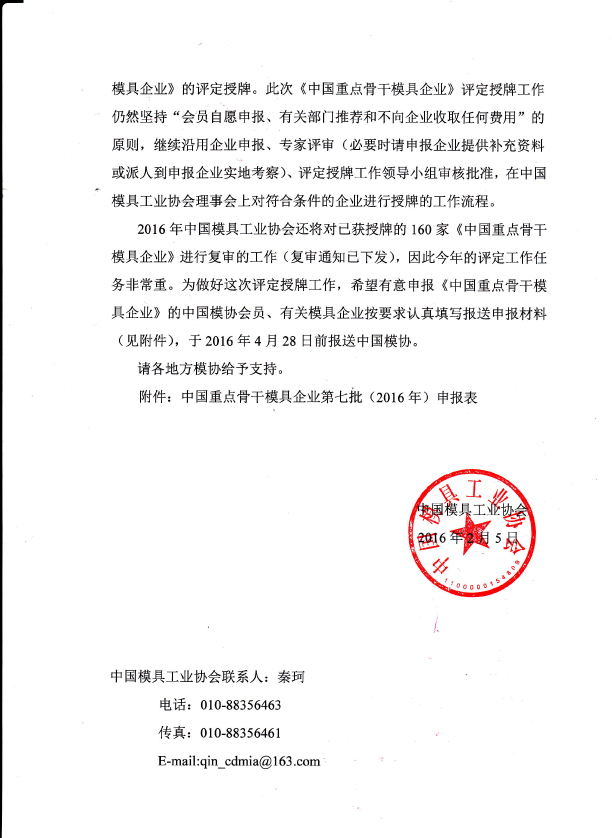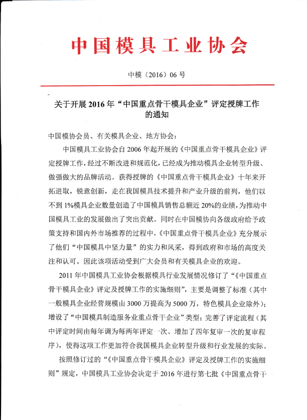 關于開展2016年“中國重點骨干模具企業”評定授牌工作的通知