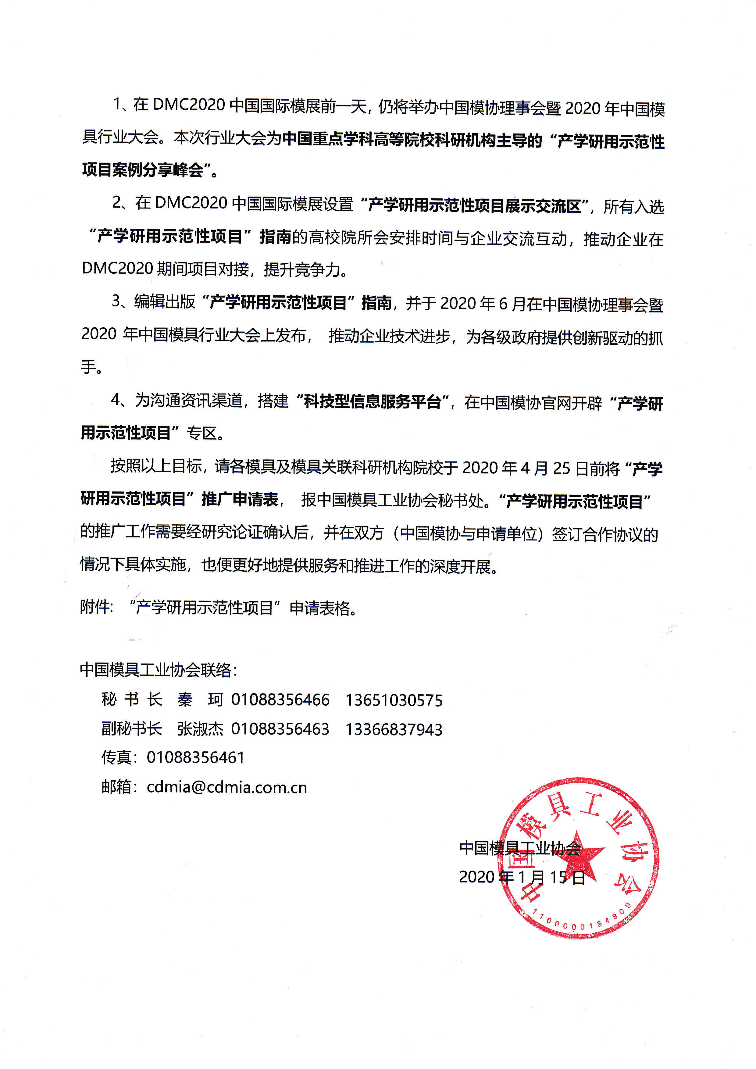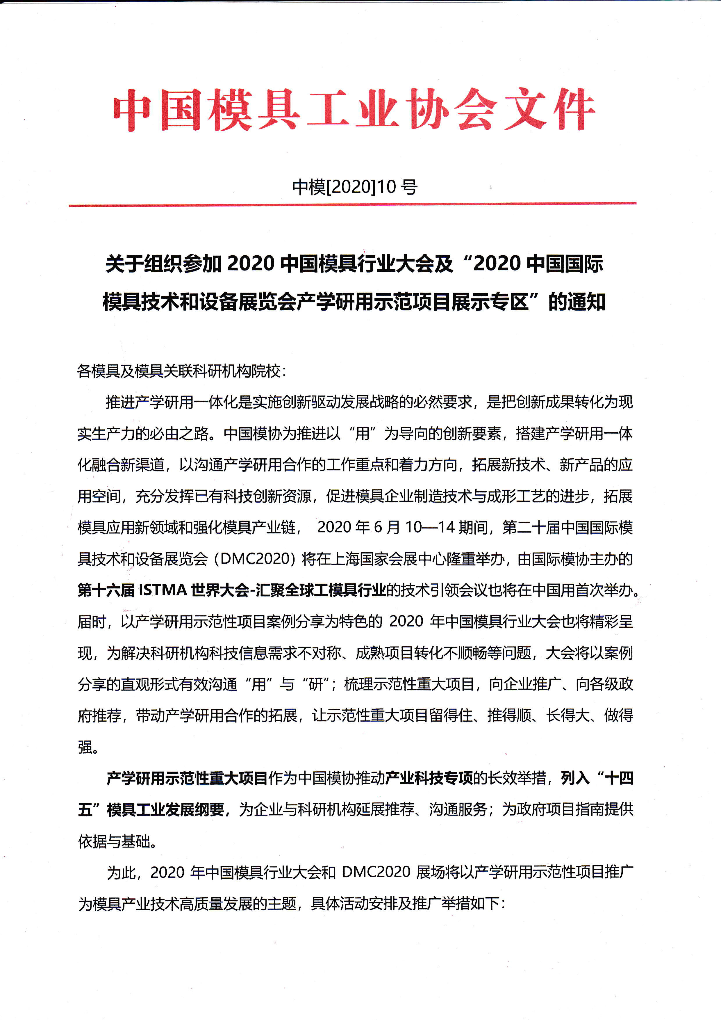 關(guān)于組織參加2020中國(guó)模具行業(yè)大會(huì)及“2020中國(guó)國(guó)際模具技術(shù)和設(shè)備展覽會(huì)產(chǎn)學(xué)研用示范項(xiàng)目展示專區(qū)”的通知